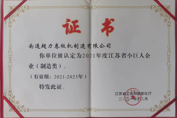 超力卷板機(jī)獲2021-2023年度江蘇省小巨人企業(yè)證書